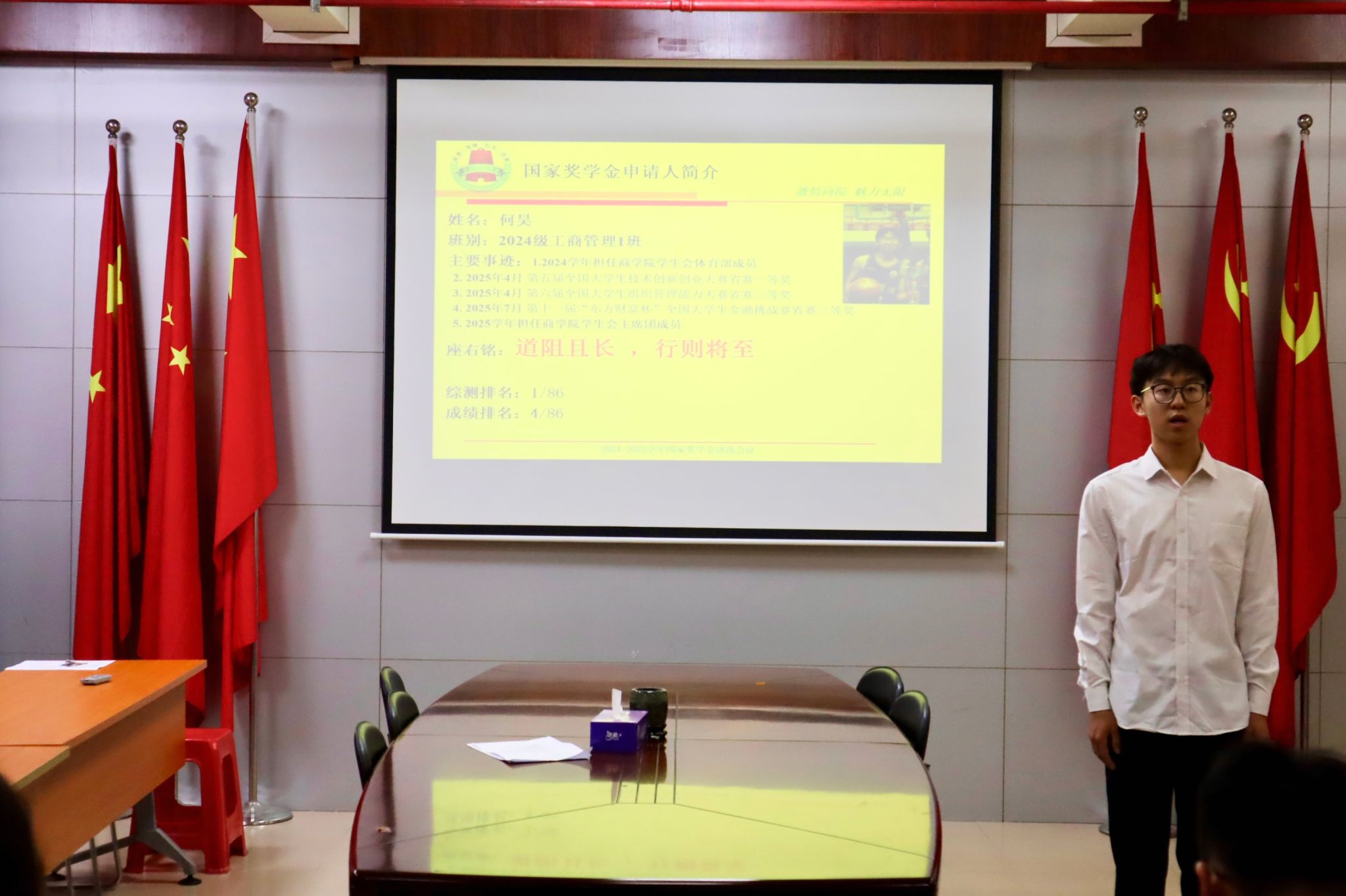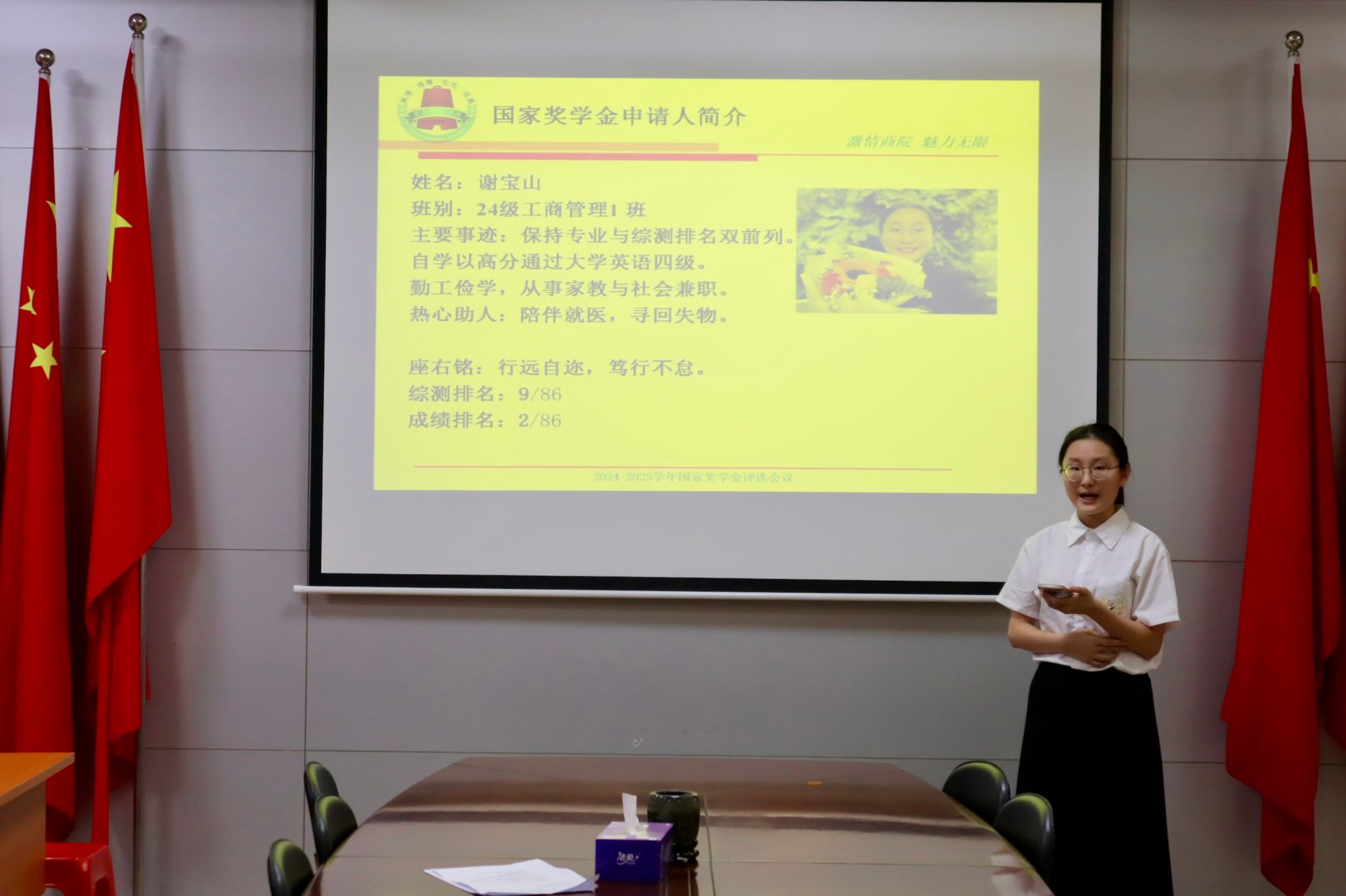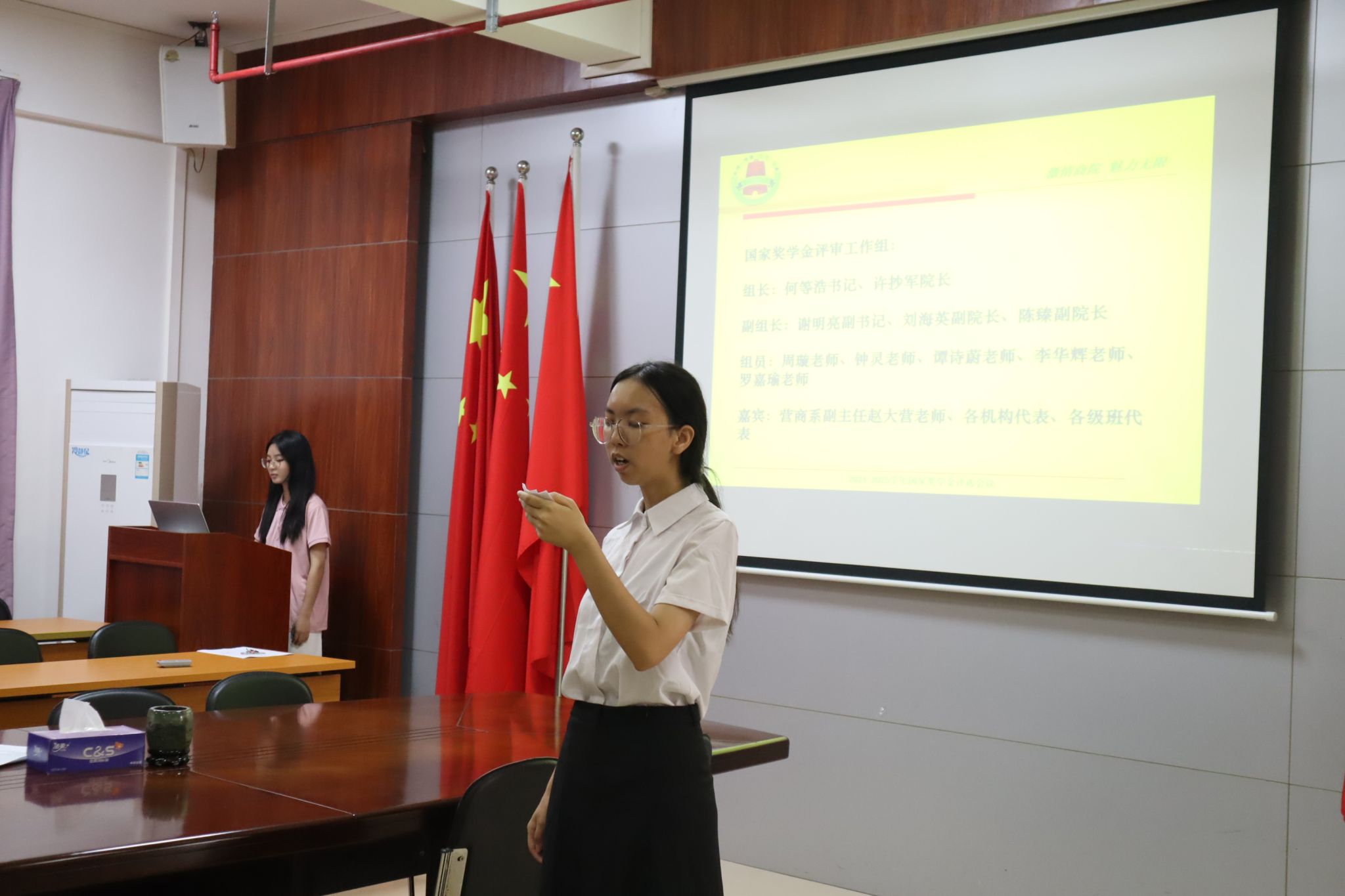 9月22日中午,商学院于燕雷楼C栋309室召开2024-2025学年国家奖学金评审答辩大会。商学院勤工中心指导老师李华辉、营商系副主任赵大营、商学院辅导员谭诗蔚、钟灵、罗嘉瑜、姚乔莎以及各机构代表以及各级班代作为评委出席此次会议。本次会议由商学院勤工中心刘峰琳主持。