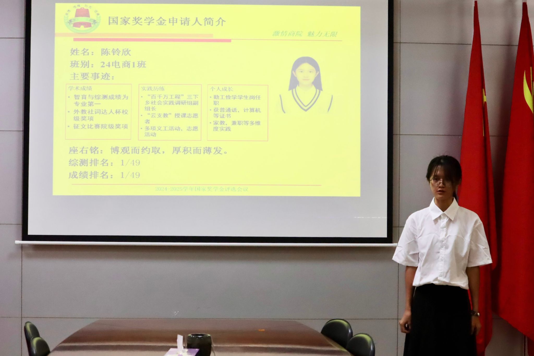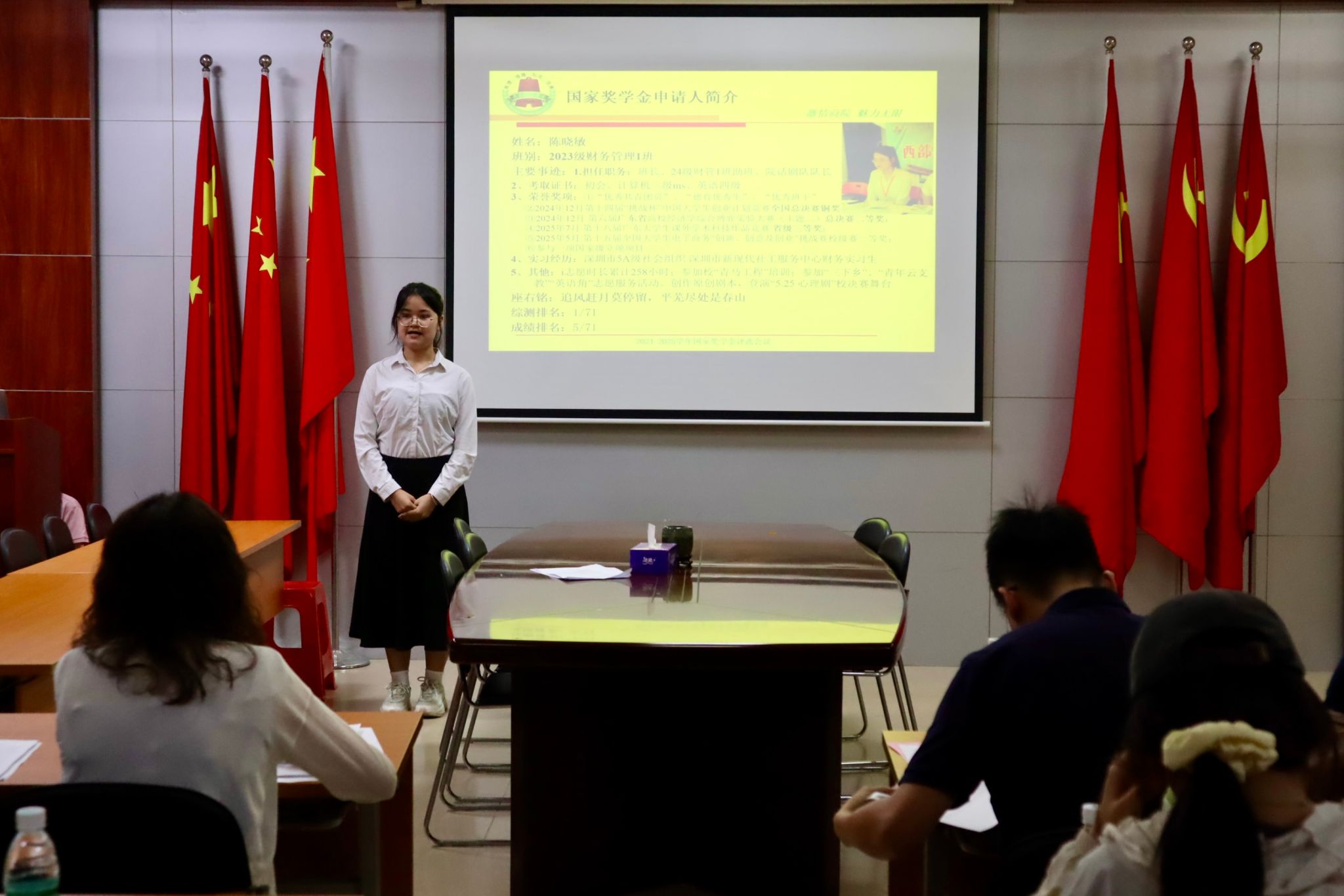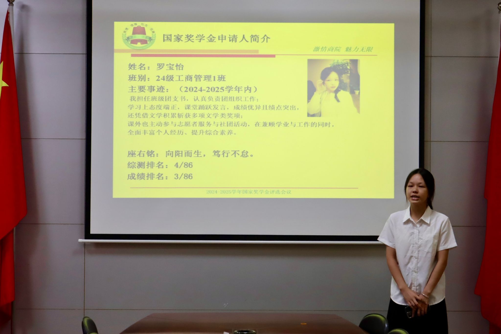 9月22日中午,商学院于燕雷楼C栋309室召开2024-2025学年国家奖学金评审答辩大会。商学院勤工中心指导老师李华辉、营商系副主任赵大营、商学院辅导员谭诗蔚、钟灵、罗嘉瑜、姚乔莎以及各机构代表以及各级班代作为评委出席此次会议。本次会议由商学院勤工中心刘峰琳主持。