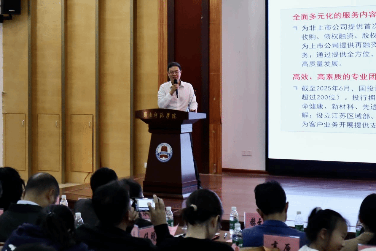 国投证券的蔡文威介绍了公司具有央企背景,服务于国家战略,拥有网点多,业务牌照全,业务多元,已持续盈利19年。他指出此次来参加宣讲是希望日后能找到一些优秀的同学成为同事。