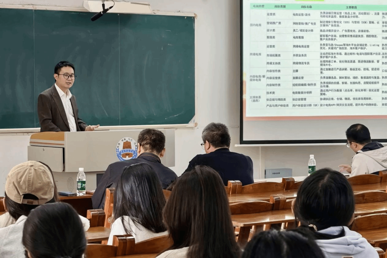 卢蔼生就“电商就业前景与职业路径规划”向同学们进行讲授。授课从“电商行业目前情况与前景”“如何规划职业路径”和“建议、提问与解答”三个方面展开。他首先向同学们介绍了国内外电商平台。随后表示,在AI时代,同学们应关注新兴高潜岗位并构建核心复合能力。他强调,要想在电商领域获得长远发展,除了岗位专业技能,还需要有意识地培养“数据思维”“用户洞察”以及“跨文化沟通能力”的通用能力。此外,随着AI技术已深度融入电商每个环节、为行业带来真正的变革,同学们也须对自身能力提出更高要求。