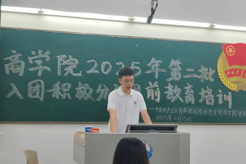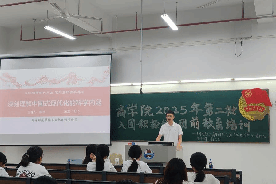 近日,岭南师范学院第五批培根宣讲团成员李源在第五教学楼A栋103室,为商学院第二批入团积极分子开展“立报国强国志,做挺膺奋斗者”主题宣讲,阐明中国式现代化是强国复兴的康庄大道,阐释新时代青年在推进中国式现代化进程中的使命与担当。宣讲现场气氛庄重热烈,学子们专注聆听、认真记录。