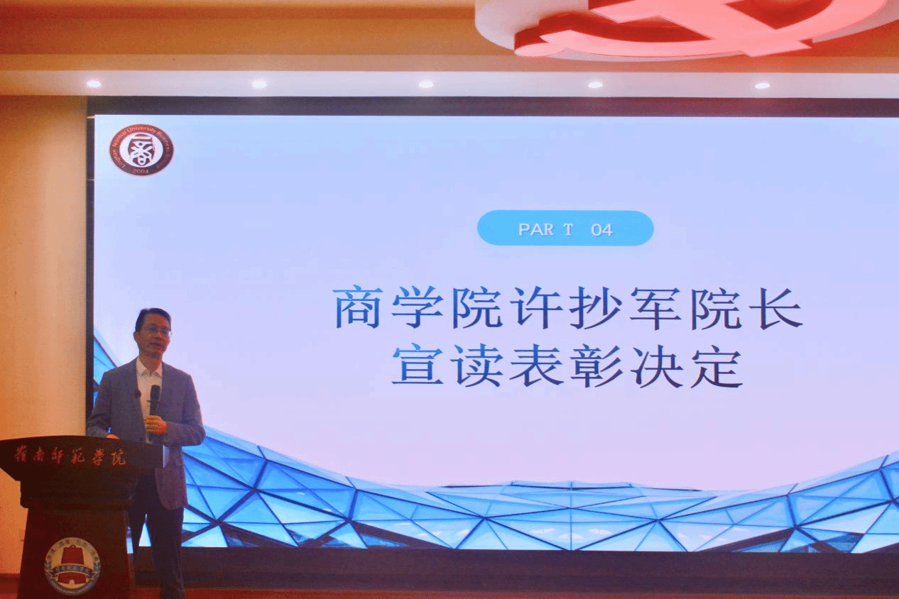 许抄军宣读本届商道文化节学科竞赛表彰决定,肯定了2024-2025学年商学院师生在全国赛事中的优异成绩,同时提出希望广大学生严于律己,刻苦学习,全面发展,努力成长为德智体美劳全面发展的社会主义建设者和接班人。