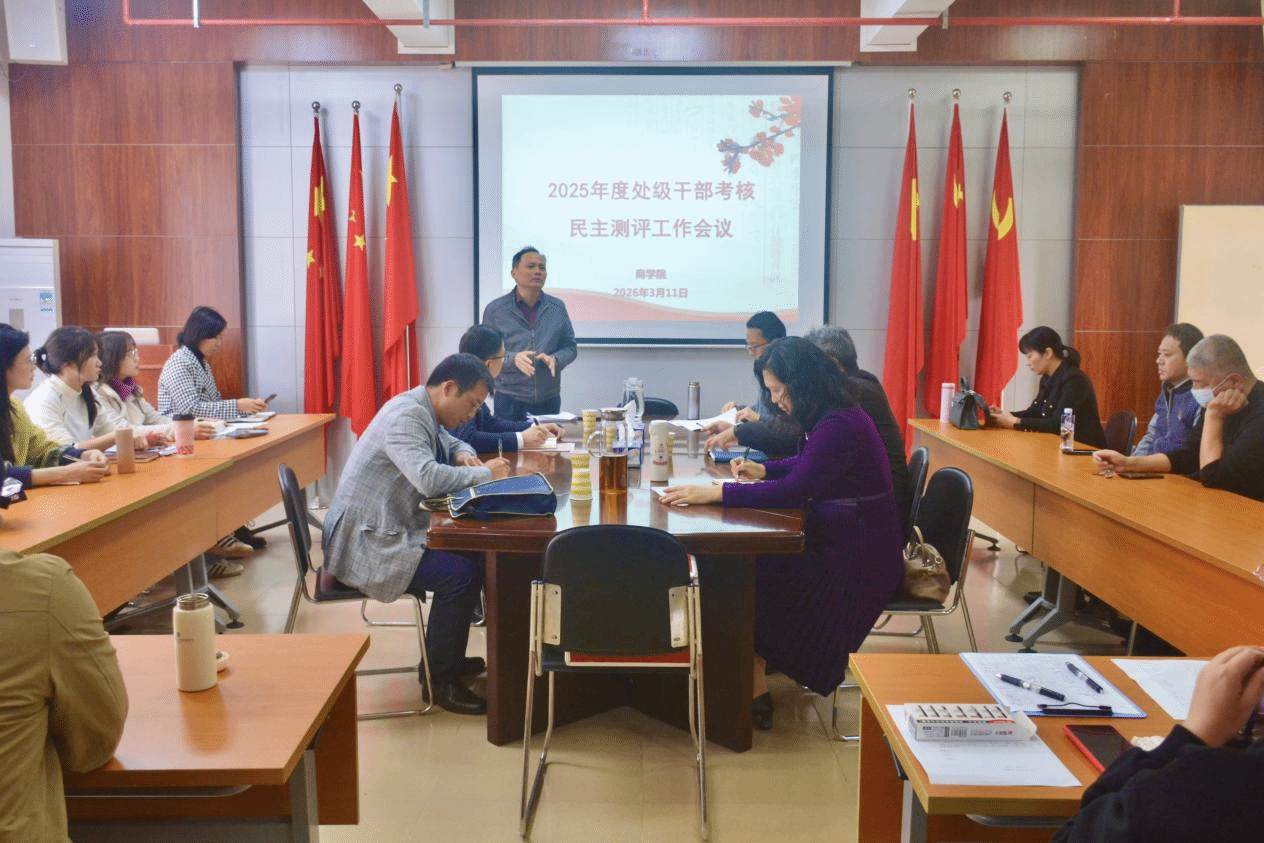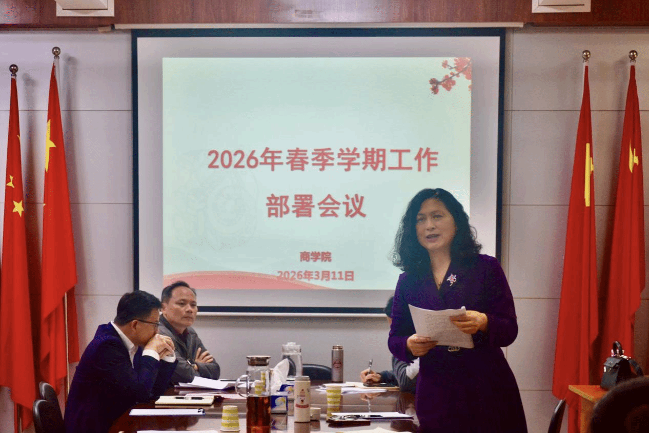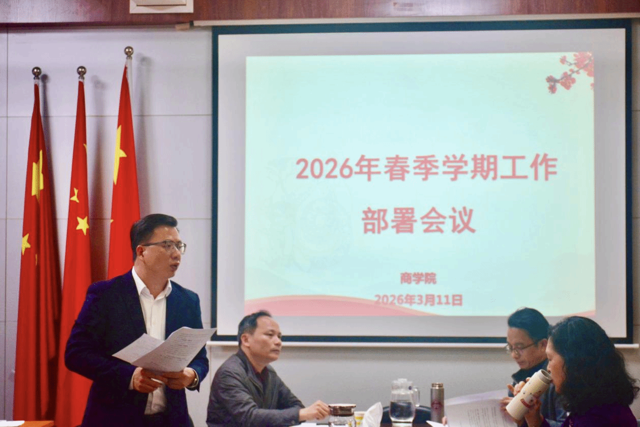 3月11日下午,商学院于燕雷楼C栋309室召开春季新学期教职工大会。商学院领导班子和全体教职工出席本次会议,本次会议以深入学习贯彻习近平总书记关于高质量发展的重要论述和全省高质量发展大会精神为主题,传达学校2026年工作会议部署,系统谋划商学院2026年重点任务。本次会议由商学院院长许抄军主持。