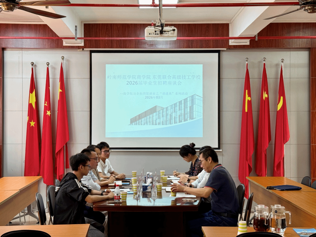 3月27日下午,商学院访企拓岗促就业之“请进来”系列活动——东莞联合高级技工学校招聘座谈会在燕雷楼C栋309室顺利举行。商学院党委书记何等浩、党委副书记谢明亮、副院长刘海英及营商系主任王松波,东莞联合高级技工学校校长黄锡永、校长特助赖珍,以及该校张贵元、陈梓煜老师出席本次座谈会。本次会议由商学院党委副书记谢明亮主持。