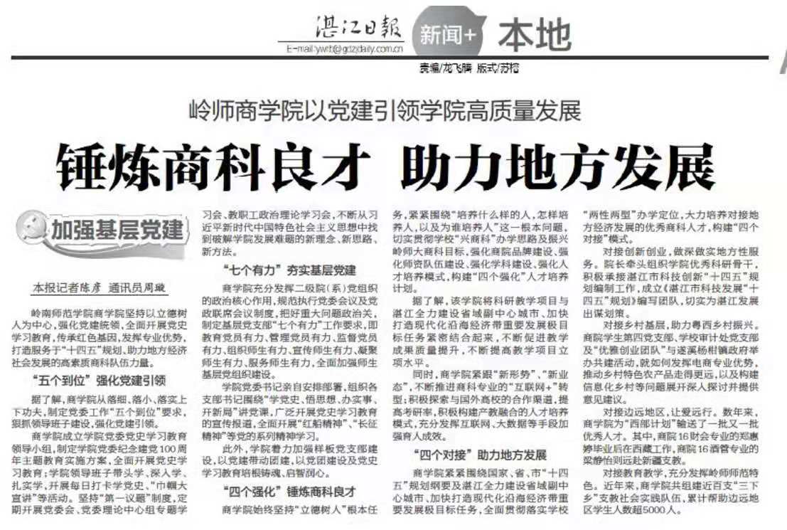 6月14日,商学院以“锤炼商科良才 助力地方发展”为主题的党史学习教育成果于湛江日报第五版刊登。