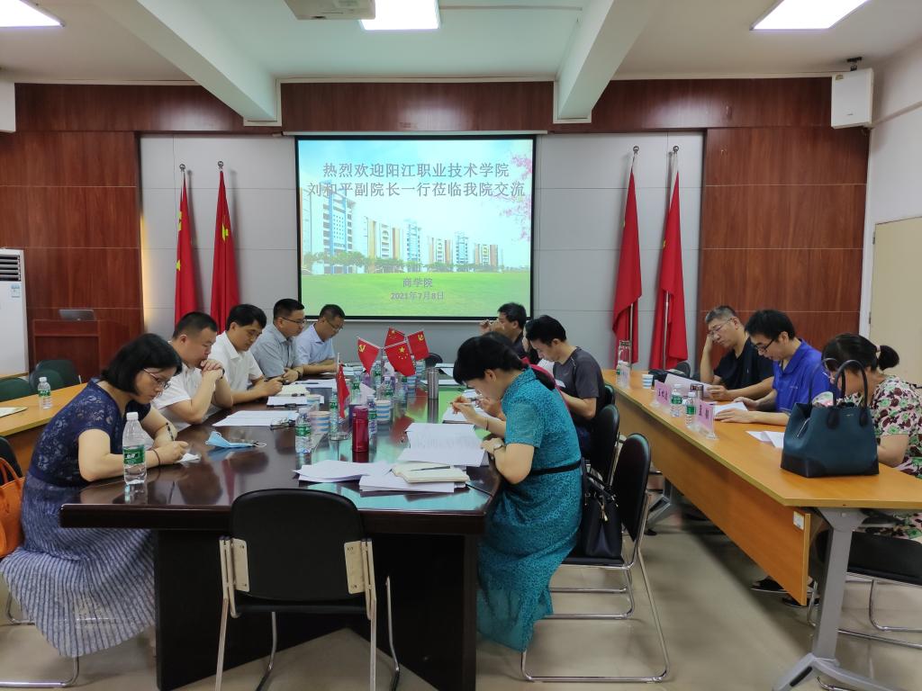 2021年7月8日,阳江职业技术学院刘和平副院长带领教务处、信息工程系主要负责人等一行5人到我院洽谈电子商务专业专本衔接的人才培养方案和转段考核相关事宜,我校教务处夏加亮副处长及商学院许抄军院长、李春霞副书记、刘海英、陈臻副院长等出席了交流会。