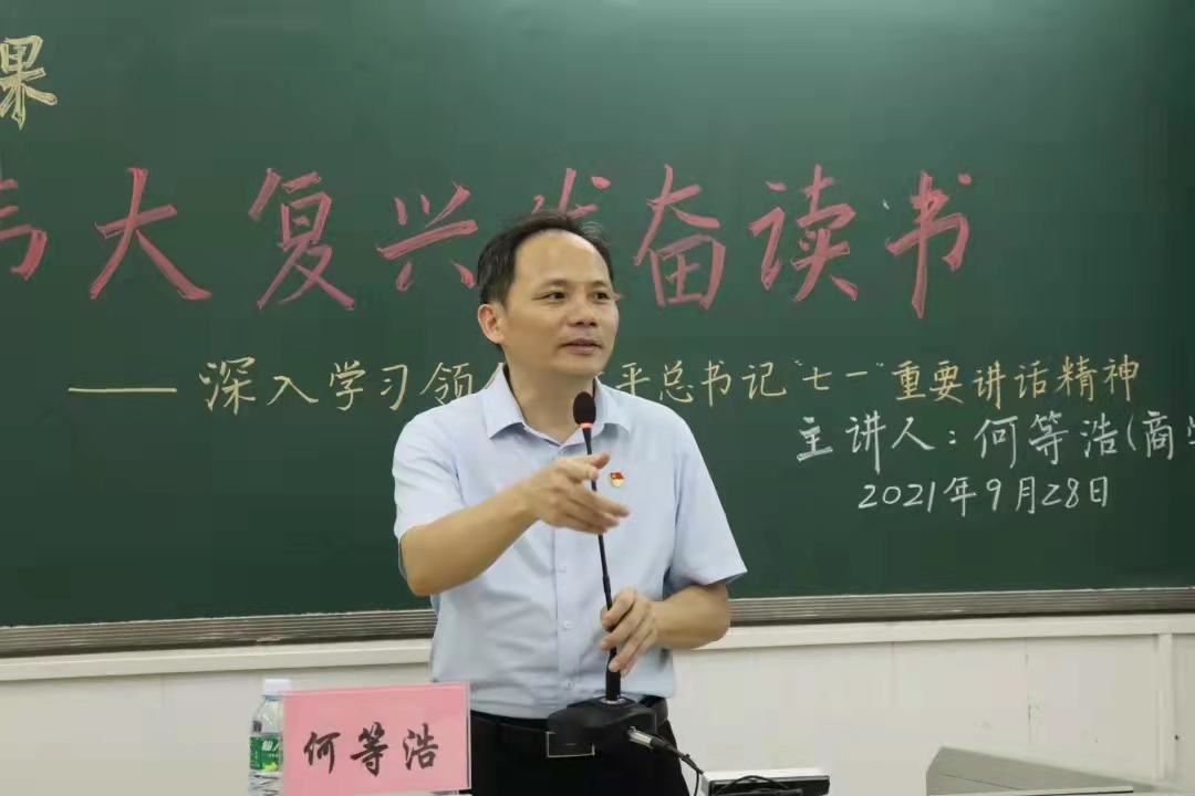 9月28日晚,商学院党委书记何等浩以“为中华民族伟大复兴发奋读书——深入学习领会习近平总书记‘七一’重要讲话精神”为主题,于燕雷楼701室给商学院21级新生代表开讲“思政第一课”。