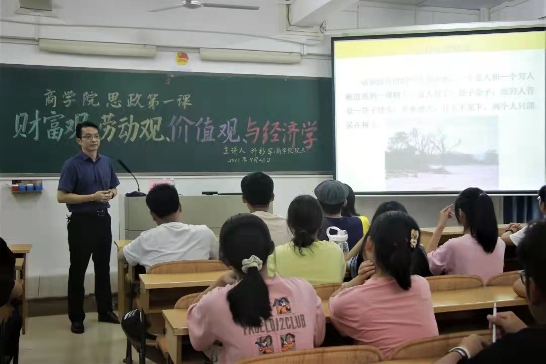 9月28日晚,商学院院长许抄军以“经济学视角的财富观、劳动观和价值观”为主题,于燕雷楼703室给商学院21级新生代表开讲“思政第一课”。