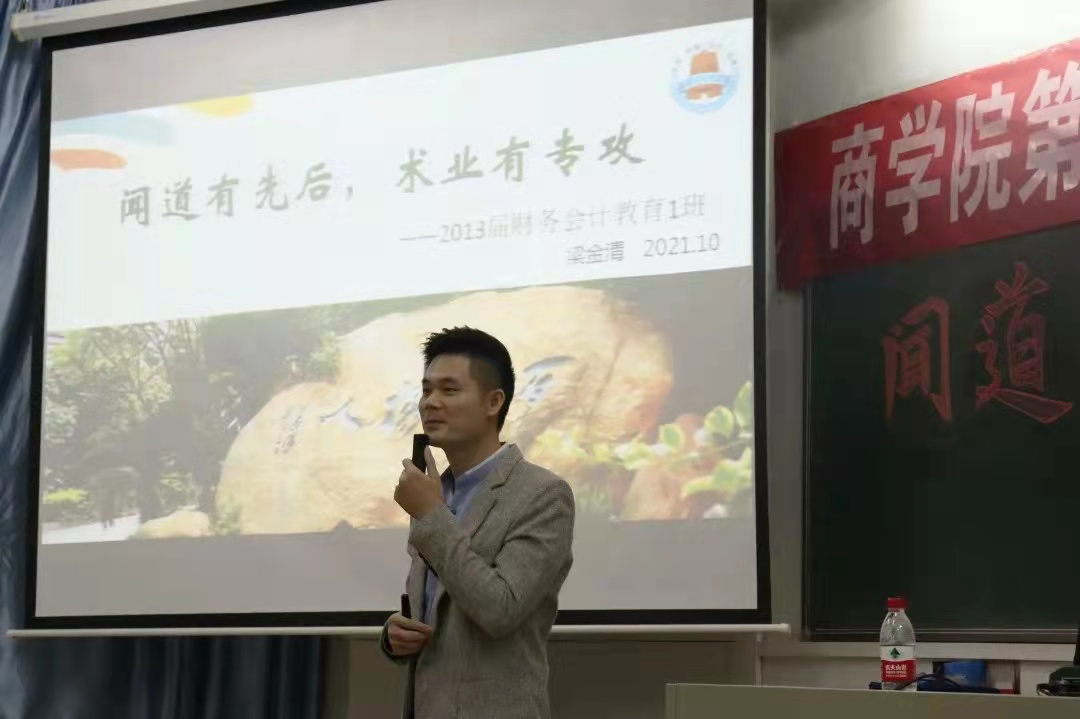 10月21日晚,商学院于燕雷楼802室开展第六届商道文化节之“商道英才荟”活动,东莞市电子科技学校项目经理、商学院2013届财务会计教育专业校友梁金清为21级新生代表作“闻道有先后,术业有专攻”主题讲座。