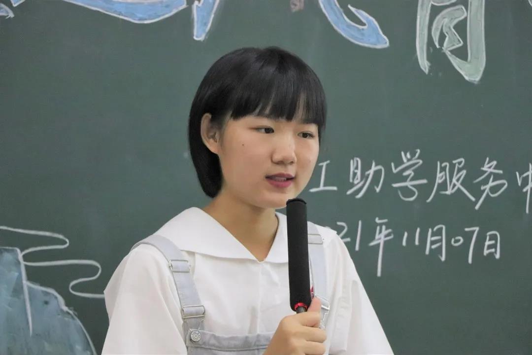 陈美淇作总结发言。她对同学们提出了三点建议:一是要先明确家教活动的意义;二是要提高自身专业素质,坚守职业道德;三是要学会总结和归纳,不断提升社会实践能力。