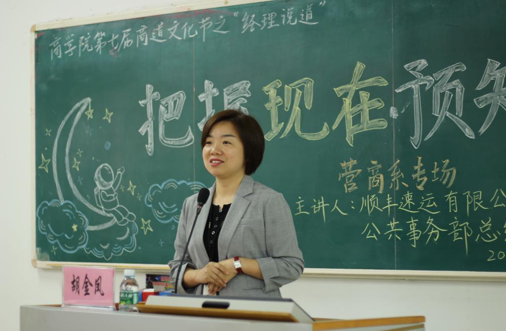 11月14日上午,商学院于弘雷楼205室举办第七届商道文化节之“经理说道”活动。本次活动以“把握现在,预知未来”为主题,由顺丰速运有限公司粤西区公共事务部总经理胡金凤作主讲。商学院党委副书记李春霞、营商系营商系全体老师出席本次活动。