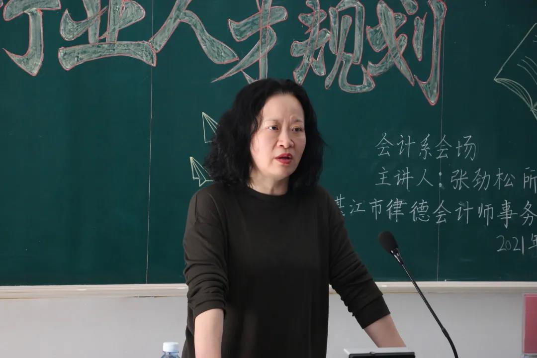 张劲松从“会计专业就业前景展望”、“会计职业发展方向和定位 ”、“会计人才素质能力要求”以及“坚定专业方向,砥砺前行”四个方面为同学们讲授了会计专业职业规划内容。“就业前景好的专业和国家发展现状是离不开的”。张劲松列举了各专业的就业前景排名数据并从就业统计结果分析会计专业的生命力及良好的发展前景。她认为,会计是一门技术,会计人才是国家人才队伍的重要组成部分,是维护市场经济秩序、推动科学发展、促进社会和谐的重要力量。会计人才应当具有良好职业操守、新时代发展理念、管理创新能力、全球战略眼光、社会责任感等优良品质。