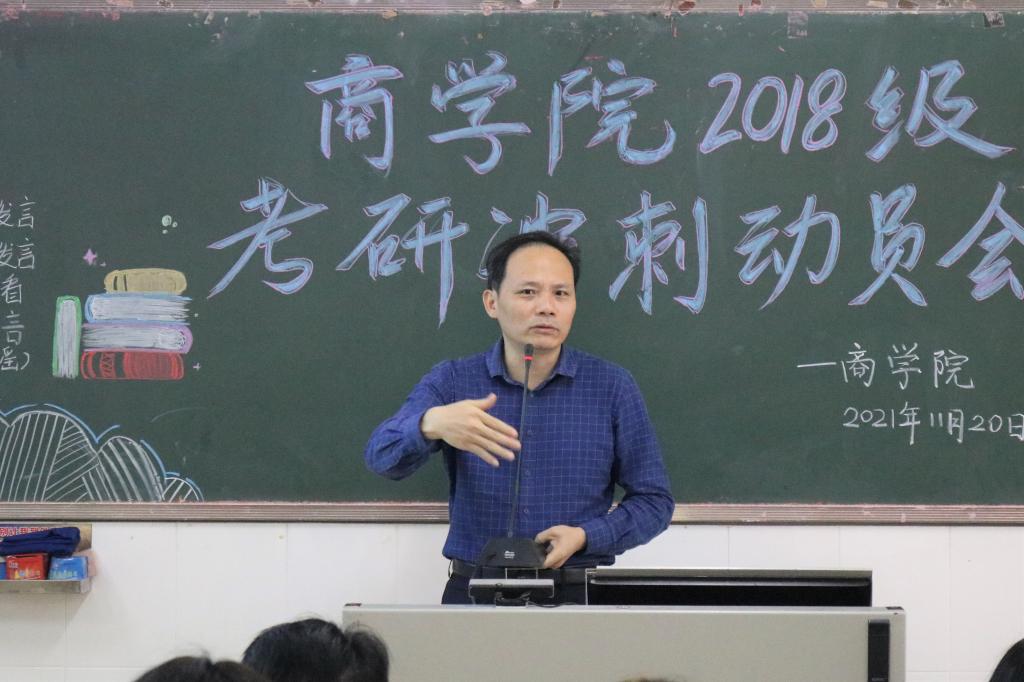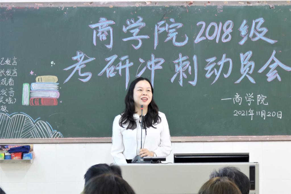 11月20日下午,商学院于燕雷楼313室开展2018级考研冲刺动员会。商学院党委书记何等浩,院长许抄军、党委副书记李春霞及学工办副主任梁康建出席本次会议。