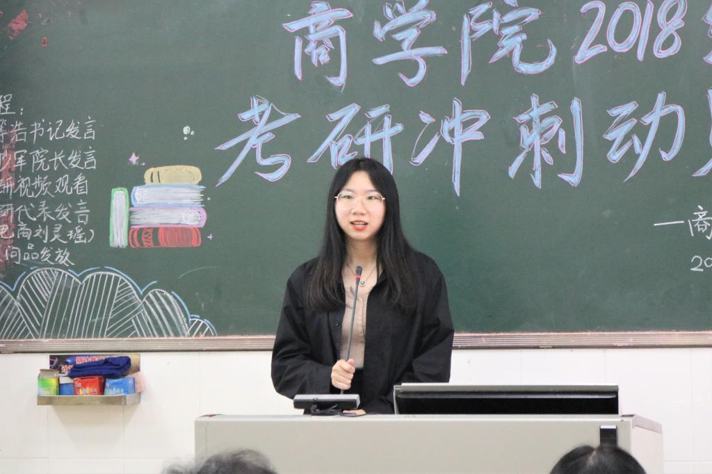 考研代表刘灵瑶发言。她代表全体考研学生感谢商学院领导及老师们的付出与关怀并表示,在接下来的备考时间中要调整好心态,坚定信心,积极备考。另外,还要注意学习方法和技巧,做好规划,做到高效利用时间,为考研做好准备。最后她祝愿一起备考的同学们旗开得胜。