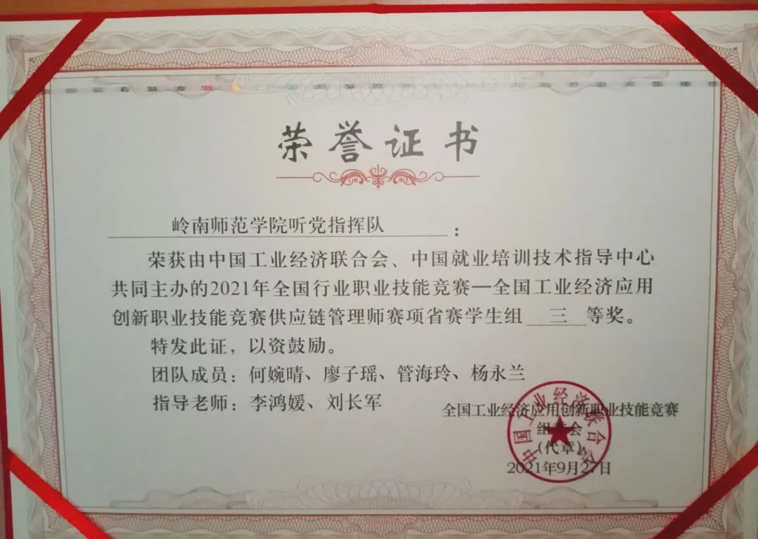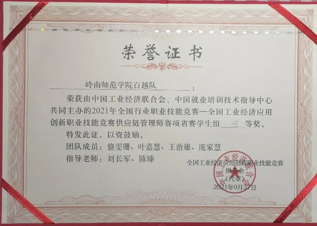 近期,由中国工业经济联合会、中国就业培训技术指导中心主办的“2021年全国行业职业技能竞赛——供应链管理师(智能供应链管理)赛项”圆满落下帷幕。在本次大赛中,由刘长军、陈臻指导的商学院“百越队”、“听党指挥队”, 在与来自深大、华师等多所高校的队伍的激烈比拼中脱颖而出,分别以排名第11、第18的成绩斩获广东省三等奖。