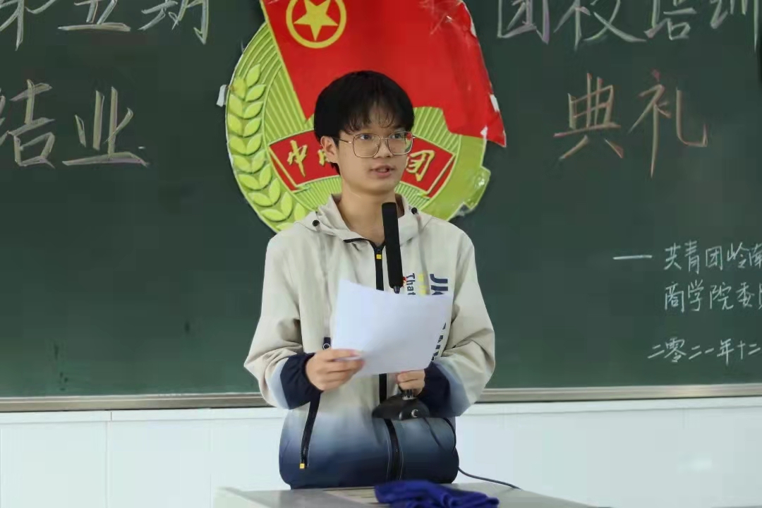 在学员代表发言环节中,来自20工管2班的优秀学员代表张淑怡表示,通过团培的学习,她对学生工作人员的责任及理论学习的重要性有了更深层次的理解。团培不仅让他们对共青团有了更多的认识,更让他们进一步体会到个人命运与国家命运的息息相关。来自20国贸1班的郑瑞玉则表示,团培使她更明白了共青团的性质,身为共青团员,要严格要求自己,在行为和思想上积极向党组织靠拢,珍惜大学生活,努力学习专业知识,成为有理想、有道德、有文化、有纪律的共产主义事业接班人。