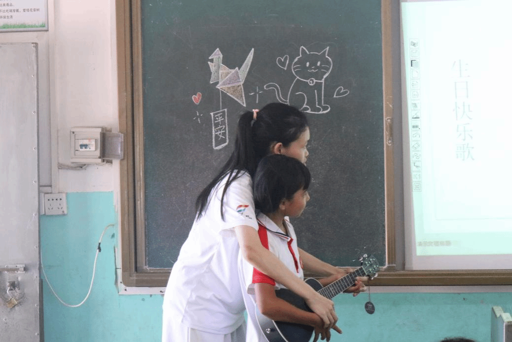 支教组组员梁子欣给同学们带来了乐器教学。她手把手地教授同学们去了解并熟悉尤克里里的弹奏规律和方法,与他们一对一互动,深入交流,探讨他们在音乐方面的兴趣,带领他们试唱《小星星》《小毛驴》《粉刷匠》等耳熟能详的歌曲。