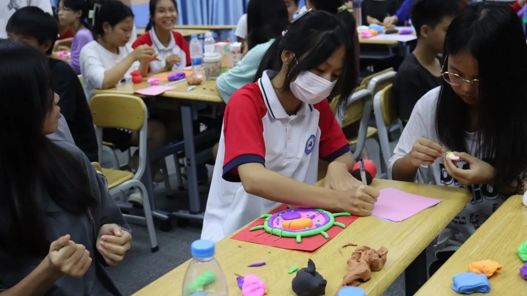 紧接着,杨舒媛给学生们发送“超轻粘土”,让他们自由发挥想象,以自己对生物的了解制作生物细胞。五颜六色的粘土通过他们灵巧的双手,变成了千形万状的细胞。