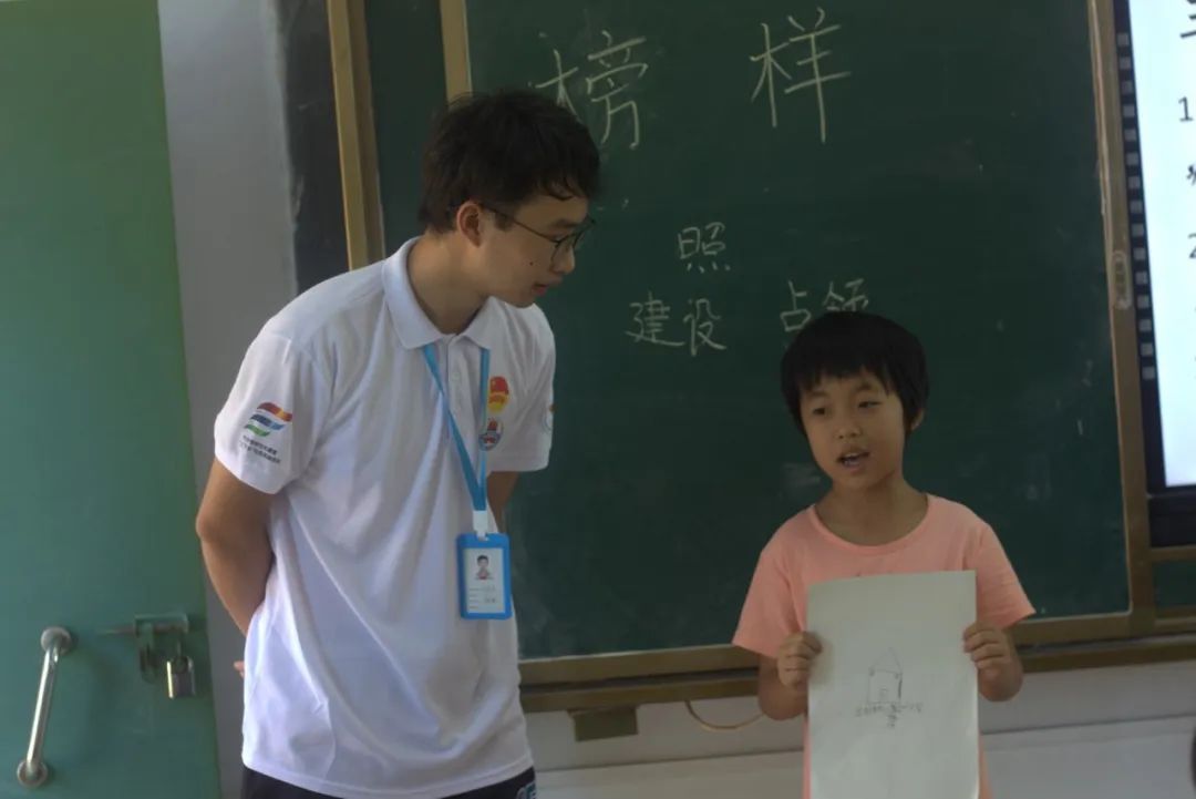 为了加深学生们对授课内容的印象与理解,支教组队员开展了课堂互动环节,让学生们在纸上画出心中的谭平山先生形象,用一句话说明自己绘画的理由,表达出谭平山带来的影响,并鼓励学生上台分享。