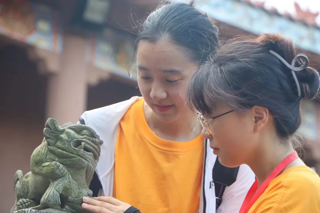 队员们触摸石狗雕像(“瞭望”社会实践队摄)