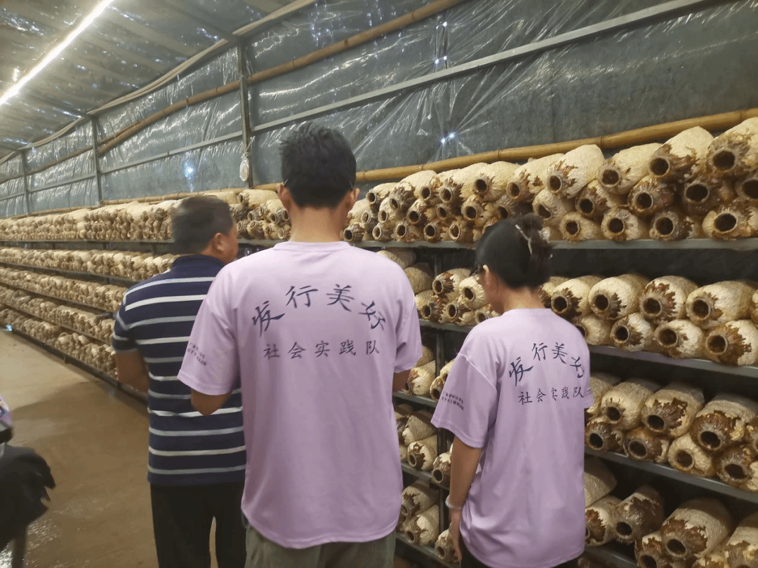 队员与合作社技术人员在车间参观菌菇包(“发行美好”社会实践队摄)