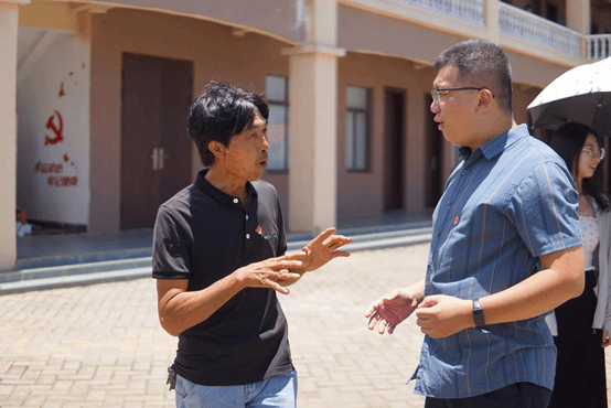 村长在给领导讲解基地及队员实践情况(“瞭望-下洋”社会实践队摄)