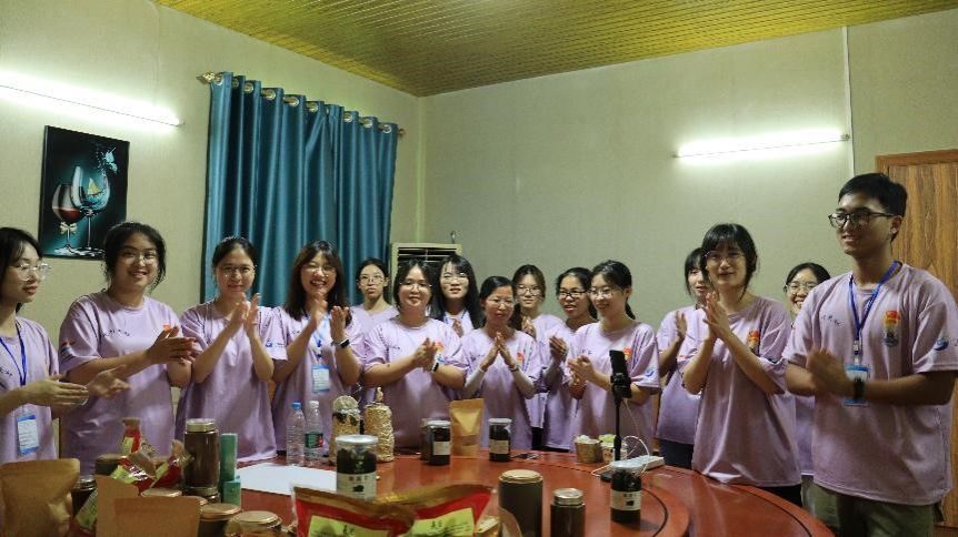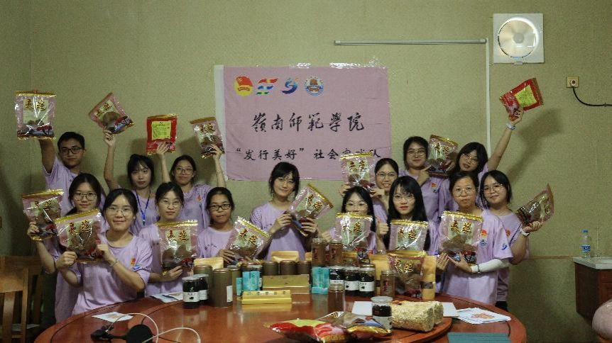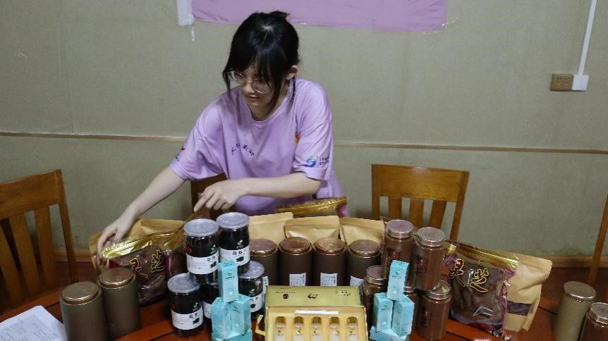 “发行美好”社会实践队队员在摆放直播产品(吴婉婷摄)