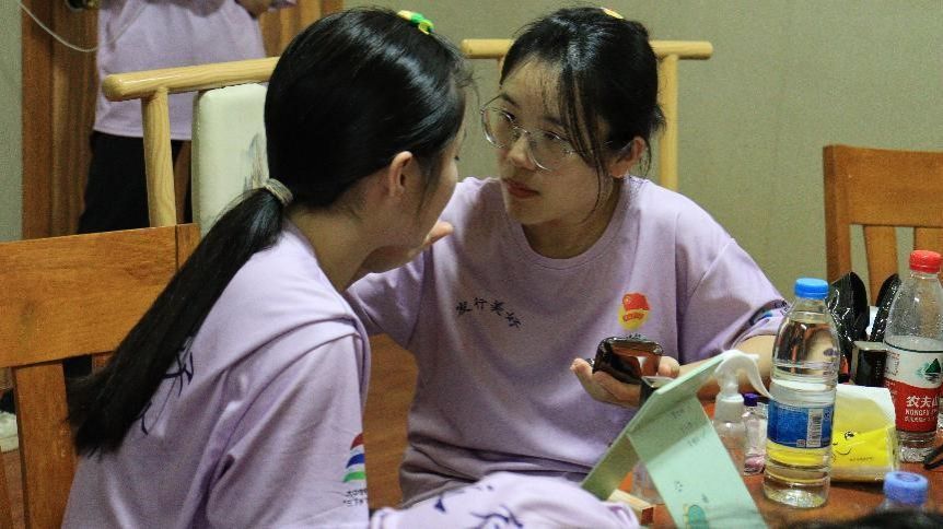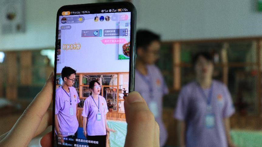 “发行美好”社会实践队队员相互帮助,为直播做好准备(吴婉婷摄)