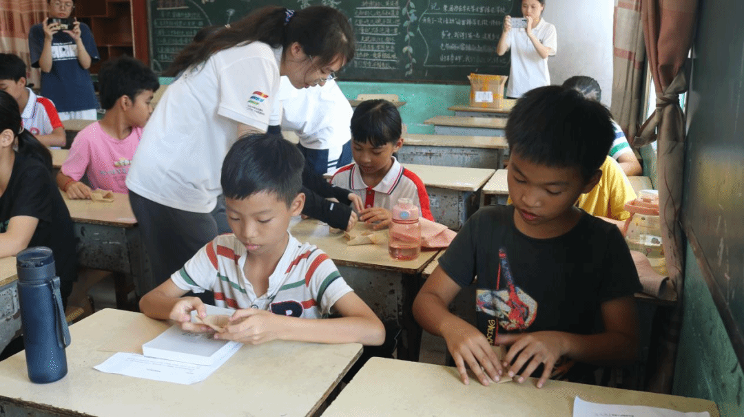 支教组成员与学生们一起折纸(“青春夏乡”社会实践队)