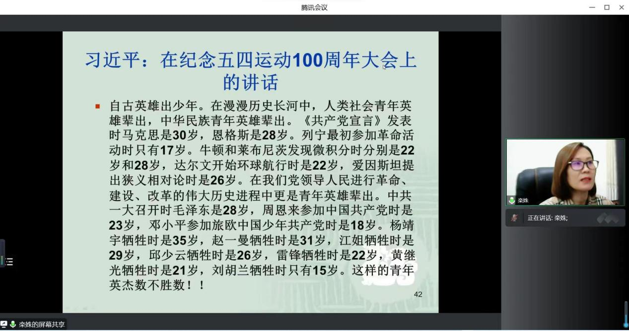 栾姝院长还运用了马克斯、恩格斯、达尔文等人少成材的典例,强调自古英雄出少年,启发学生独立思考,积极践相统一,增强调适能力,树立正确的价值观,发展健康人格。最后以习近平在纪念五四运动100周年大会上的讲话结尾,积极落实了立德树人根本任务,引导了同学们找准航向,扣好人生“第一粒扣子”。