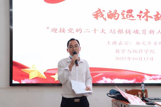 会上,郑光华老师做“我的退休故事”的师德主题宣讲,分享了她为同学服务的退休故事。郑光华老师离开了数学讲台,然而没有离开同学们,她退休后拿起了“四史”读本,始终带头学习和弘扬社会主义核心价值观,用自己的模范行为和高尚人格感召学生、带动学生学党史、铭党恩、跟党走。平时还收集有关学生教育的彩图和信息剪纸,装订成册供学生阅读。创办了谈心亭,帮助学生排忧解难,积极呵护关爱学生成长,引导好学生的健康成长。同时,她带领学生开展各种“红色”活动,把“红船精神”“井冈山精神”“长征精神”等融入活动中,用“刻纸”的艺术形式来承载“读四史”的爱国爱党教育,引领学生学党史、明国情、做表率。郑光华老师表示晚年的人生追求和最向往的境界是和同学们一道学习与传承“四史”中的英雄故事。
