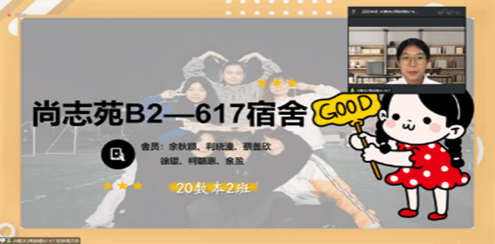 林韵老师对比赛进行总结发言。林老师肯定了这次线上举办比赛的方式,并表示在疫情防控方面人人不可懈怠。林老师还表示,在比赛中可以看到每一个宿舍的亮点,展示的宿舍都值得大家借鉴和学习。此外,林老师提了三点建议:第一点是宿舍要好好汲取苏师兄分享的经验。第二点是发言的同学要解决发言紧张,照读稿子的问题,宿舍可通过更为新颖的方式来展示宿舍的特点。第三点是面对宿舍问题,尽可能做到小矛盾早化解,大问题共商讨,大家好才是真的好。林老师表示良好的宿舍关系最是难得可贵的,希望我们可以好好珍惜大学四年的宿舍生活。