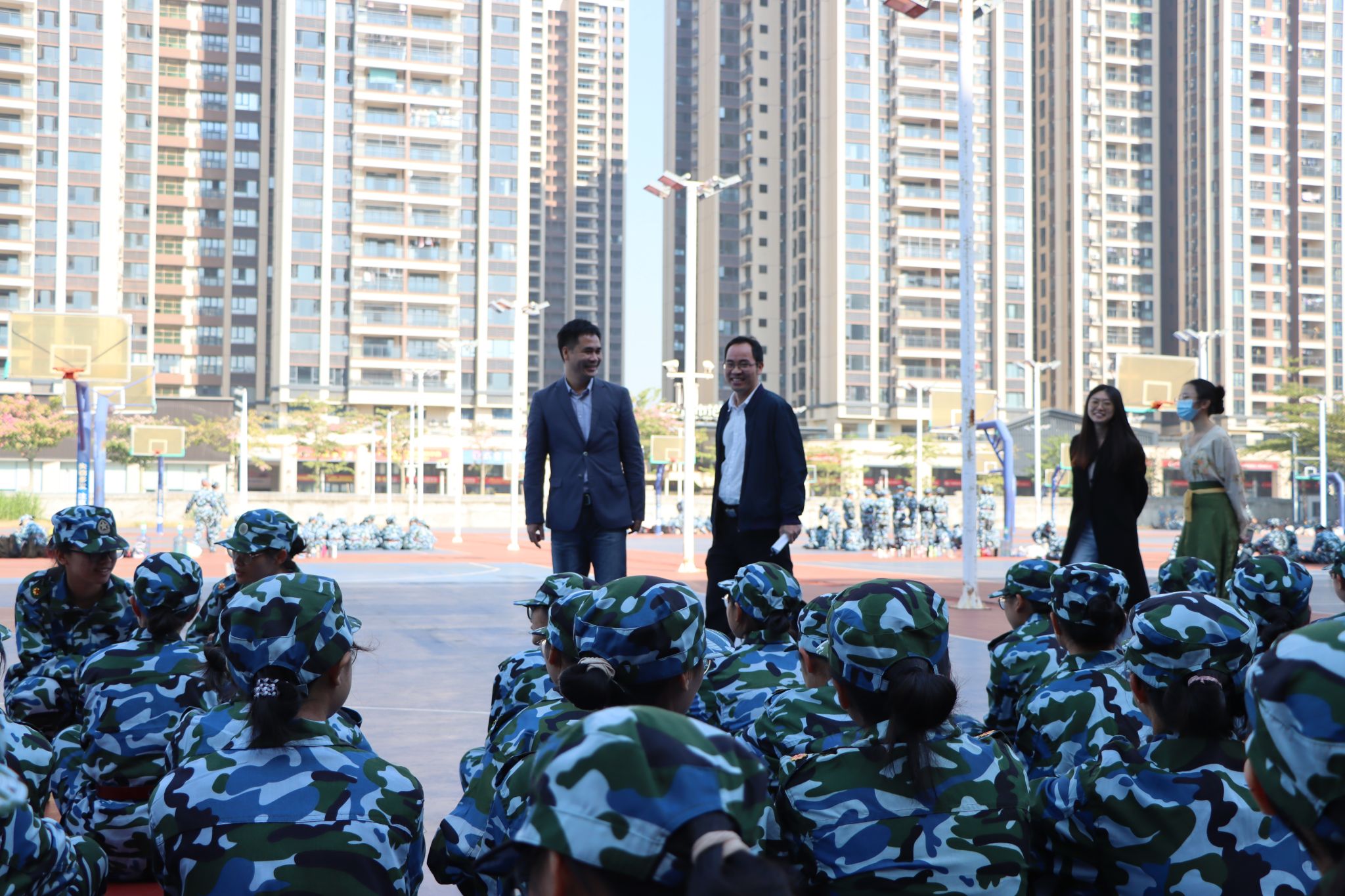 军训正当时,沙场秋点兵。在2023级新生进行军事训练期间,叶建仔书记、全光华副书记、辅导员钟诗琪老师及张嫣老师一同前往新民篮球场和田径场慰问我院2023级新生及带训教官,并了解我院新生军训情况。