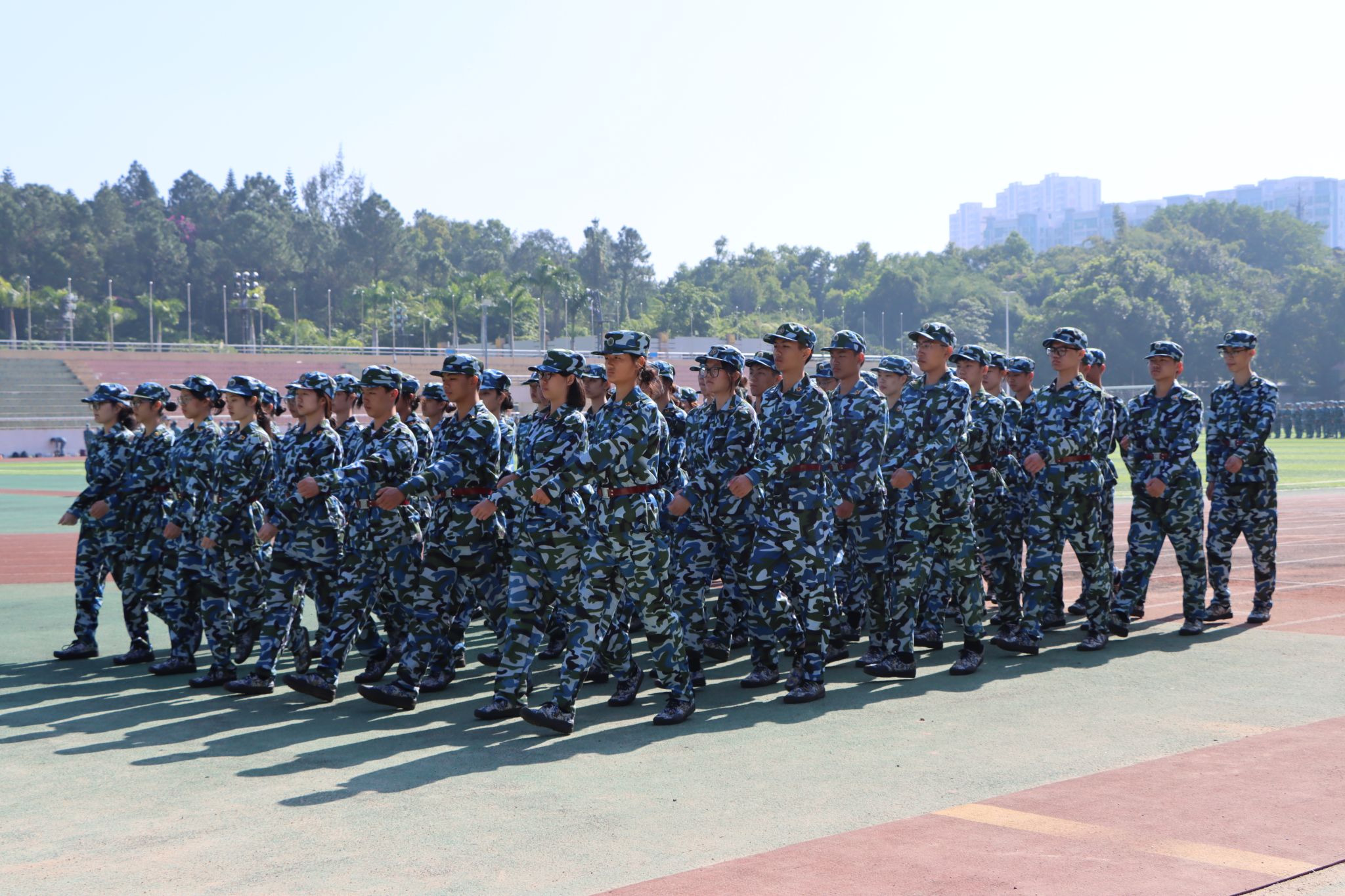军训现场,新生们口号整齐划一,步伐铿锵有力,彰显无限活力与青春本色。