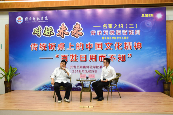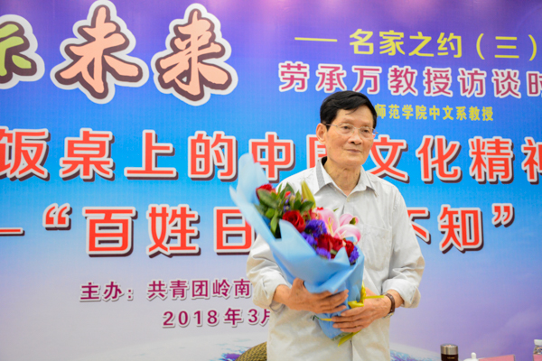 3月25日晚,我校文传院中文系的劳承万教授,受邀到校图书馆学术报告厅,给同学们作题为“传统饭桌上的中国文化精神——‘百姓日用而不知’”的对标未来名家讲座。校团委李发武书记出席活动现场,全校学生自发前来听讲,现场座无虚席。