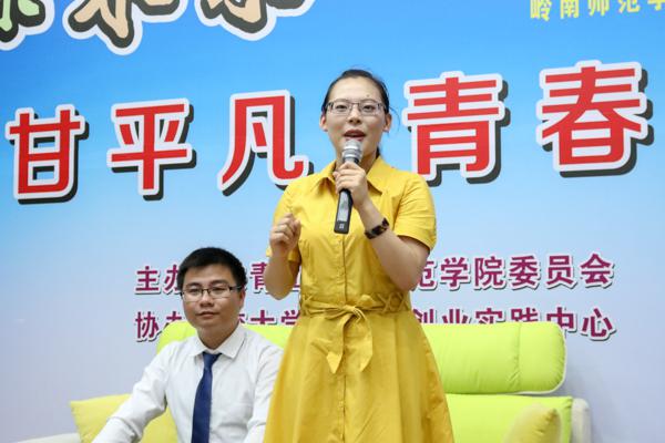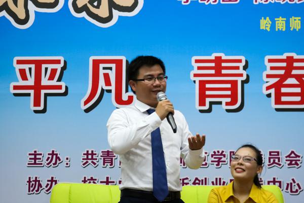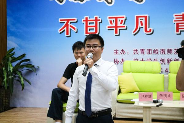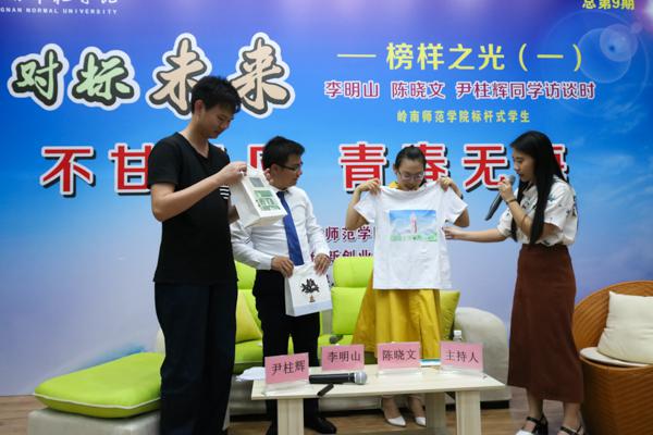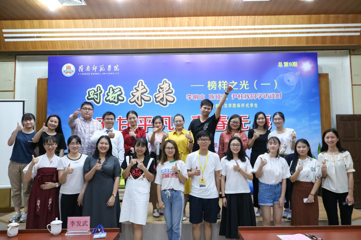 在访谈环节里,三位同学分别谈了对将来的设想。尹柱辉希望研究生毕业后先就业,在积累了一定的资本、人脉和能力后,他希望能创业,在年轻时成就一番事业,也为社会做些贡献。陈晓文则坦言自己没有太大的理想,她只希望能在10年里成为一名骨干教师,同时守护她所爱的家人,便足够了。李明山则风趣地说,先读完博士,有机会可以回岭师任教,也希望能给自己的女朋友一个温馨的家。三位同学发言毕,同学们给予他们热烈的掌声。