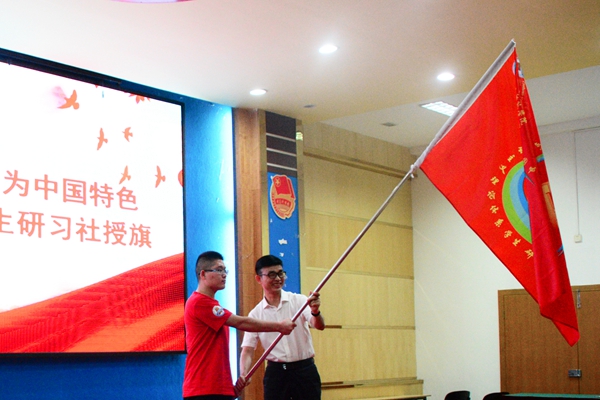校团委书记李发武主持讲座并宣读了中国特色社会主义理论体系学生研习社的成立通知,黄达海为该社团授旗。中国特色社会主义理论体系学生研习社会长车华芳在会上发言。