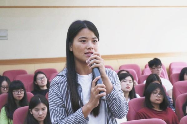 在提问环节,宣讲嘉宾与同学积极互动。当有人问到面试的通过率时,陈淑贤表示,西部计划的面试等考核,重点是考察你是否真的有坚定的意愿、做好心理准备,你的家庭是否支持你的决定,出众的能力不是考核重点。一位体科院的同学表明自己希望参加基础教育志愿服务,但是又担心当地小学的配套设施限制活动的开展。肖阳从自己的情况出发,指出志愿者教师通常会分配到乡镇合并的中心小学,基本的教学设施齐备,但这些小学很缺老师,尤其是音美体的老师。