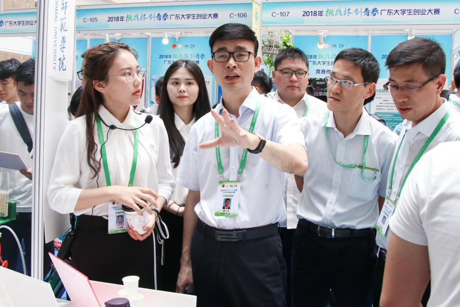开幕式结束后,来自全省各高校的领导专家、参赛师生纷纷涌入参赛作品展区。在校团委李发武书记的陪同下,校党委黄达海副书记来到我校参赛团队展区指导参赛的各项工作。黄达海认真观看了岭师团队的参赛作品,倾听各团队讲解参赛项目的核心,与队员们亲切交谈,并为他们加油鼓劲。他肯定了各团队的创业成果,为参赛队员的良好精神面貌点赞。“项目必须具有针对性,内容不要太泛。我们要尽力打造成本低、效率高的产品。”黄达海对广州行之翼科技有限公司产品的领先性和独特性尤其赞赏,也这让团队成员更加信心满满地迎接挑战。