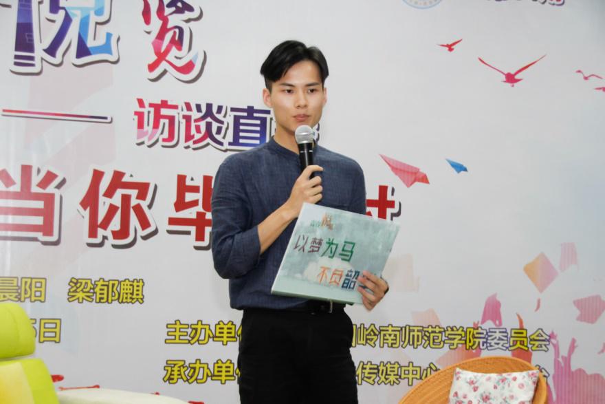 “我是来自河南新乡的罗晨阳”、“我是来自广东茂名的梁郁麒”、“我是来自广东肇庆的梁友明”,直播以一场新奇有趣的“新生入学自我介绍”模拟场景开始。回忆起初入大学,三位嘉宾的自我介绍都是由“我从哪里来”开始;而如今毕业在即,他们面对各种场景,说的更多的可能会是“我来自岭南师范学院”。这个变化可能很多人没有注意到,但它象征了同学们从青涩到从容、从家乡到岭师的逐步成长,而今他们风华正茂,即将迈向新的旅程。