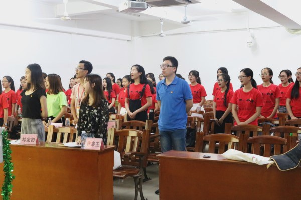 2018年6月10日晚,17英语(7)、(8)班团支部于教三504举办了以“志愿服务”为主题的团日活动,校团委莫然老师“进班蹲点”此次这次活动,黄少萍师姐以导学员的身份参与活动。