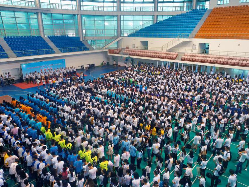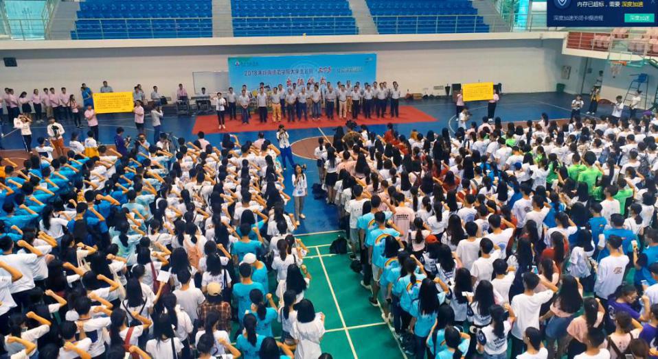 7月14日上午,我校2018年大学生暑期“三下乡”社会实践活动的出征仪式无畏风雨,在体育馆如期举行。学校党委黄达海副书记为实践代表队授旗并宣布出征,号召岭师学子在实践中成长,在奉献中成才,用青春智慧为社会发展和学校推进新师范建设、实现申硕的核心目标做出新的积极的贡献。全校2000多名学生冒雨参加,出征仪式吸引了广东、海南、广西等省市媒体的关注与报道。