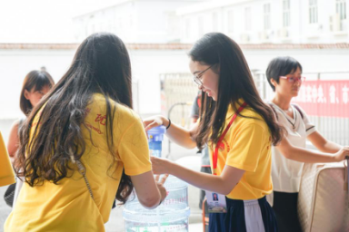 干部给新生和家长准备水(雷韫祺摄)