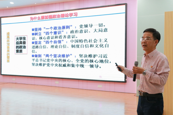 王栋指出当代大学生要加强培养自己的政治素养。要坚持“党领导一切”,牢固“四个意识”,坚定“四个自信”,做到“两个坚决维护”,确保党中央决策部署落地生根。