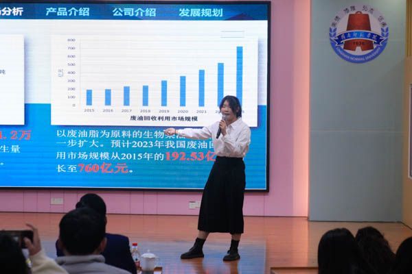 本次比赛分为陈述环节和答辩环节。各团队主讲人借助答辩PPT与其他辅助材料,针对项目背景、商业规划、品牌应用、成果转化等内容向现场评委和观众作了展示,评委老师逐一进行提问和点评。