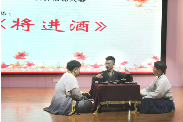 音乐与舞蹈学院的“诗人们”用情景剧的方式将《将进酒》演绎得淋漓尽致。举起金樽,仰头将酒一饮而尽,这一饮饮出了诗情,饮出了傲气,饮出了狂放不羁。数学与统计学院、物理科学与技术学院、生命科学与技术学院也将《将进酒》诵出了属于他们的风采。