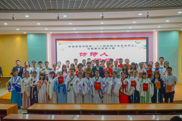 诗的语言,典藏着五千年悠久的历史文化;诗的声音,演绎着不朽历史的风骨铿锵。为激发岭师学子的诵读热情,营造中华经典,弘扬千年文明的校园文化氛围,12月1日晚,我校在教三311举行了第二十六届校园文化艺术节之“仿诗人,诵经典”诗歌模仿朗诵大赛。