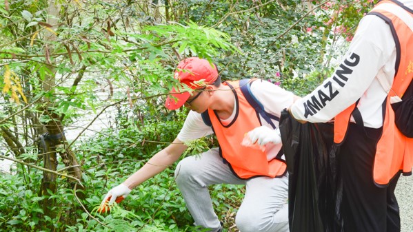 开幕式结束后,志愿者们分工明确,对不同区域进行卫生清理与环境监督。烈日当空,瑞云湖上一道身披马甲、头戴红帽的靓丽风景线却尤为耀眼。志愿者们拿着垃圾袋、钳子、扫把等,沿着河道清理垃圾杂物。大到纸盒、包装袋,小到烟头、纸屑,任何一个肉眼能看见的地方,每一个死角都逃不过他们的“法眼”。服务期间,志愿者们见到垃圾卡在草地缝隙间,一声不吭,直接用手捡起。大家不怕脏,不怕累,积极而认真地进行清扫工作。天气炎热,志愿者们汗如雨下,但毫无怨言,坚持进行清扫工作。在大家的努力下,瑞云湖很快便焕然一新,干净而整洁。