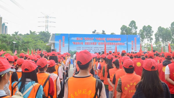 每年3月22日,是“世界水日”,也是“中国水周”第一天。为深入学习贯彻贯彻党的十九大精神和习近平生态文明思想,落实绿色发展理念,推动绿色发展,在“世界水日”和“中国水周”即将来临之际,3月20日,约1000人齐聚赤坎区瑞云湖广场,举行“争当河小青,助力湛江河更美”巡河护河志愿服务活动启动仪式。岭南师范学院127名志愿者以饱满的热情投身于护河工作,助力活动的顺利开展。
