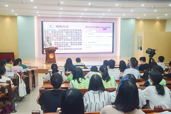 “同学们应该从为什么要选择这个主题、调查要解决什么问题、解决到何种程度、本着怎样的指导思想进行调查研究等角度进行思考,明确调研的意义、社会价值所在。”林兴就调研主题从社会调查类别、调查目的、调查方法、调查成果和撰写调查报告常见的问题五方面进行讲解。他向同学们阐释实地调查、走访调查、文献调查等六种调查方法之间的优劣异同,并鼓励实践队员从选题、题目和内容等方面提升“三下乡”调研质量。